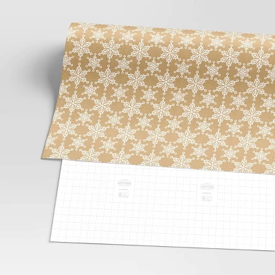 Give holiday gifts in festive style by wrapping them in this Christmas White Flakes on Faux Kraft Gift Wrap from Wondershop™. Adorned with an allover white snowflake print on a golden background, this festive gift wrap adds the perfect holiday cheer to your gifts. This paper gift wrap comes in a 125-foot length roll that makes it great for wrapping a variety of holiday presents.